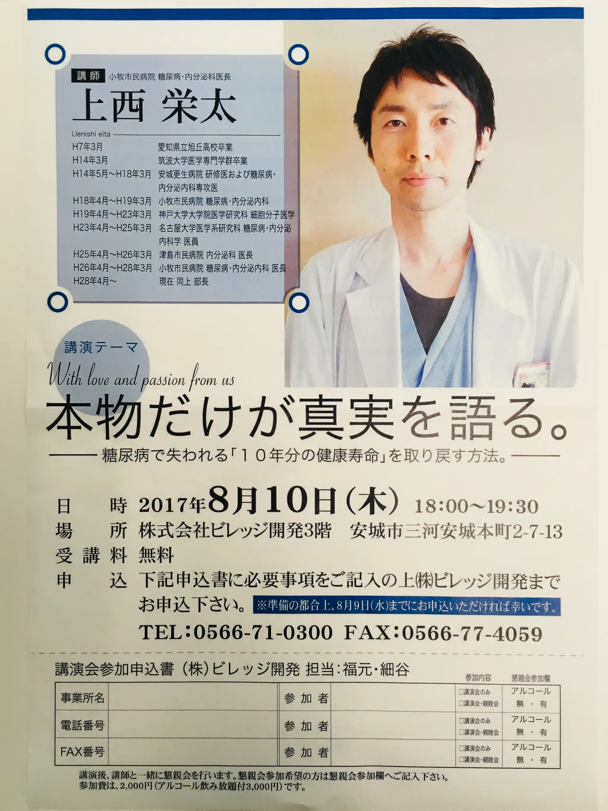 その後、神戸大学大学院医学研究科で糖尿病の基礎研究に従事し、名古屋大学医学系研究科、津島市民病院医長、小牧市民病院部長を経て、2018年に「糖尿病・甲状腺 上西内科」を開院。